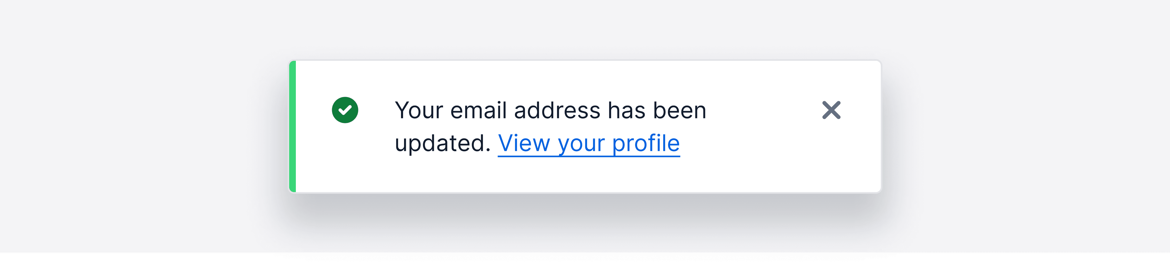 In this example, a success toast uses multiple distinguishing visual elements—the thick left border and the icon—along with green colors to further convey to a user that an action they just took was successful.